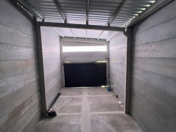 Todo fechado, com placas estruturais e telhado galvanizado.
